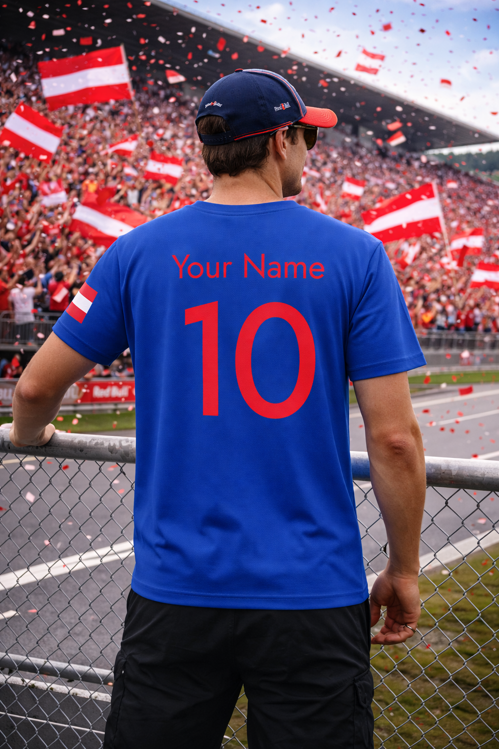 Elevate your game-day experience with this vibrant Men's Sports Jersey inspired by the team that gives you wings! Featuring a crest with a bull with the teams colors with 6 starts representing the times they have been crowned Constructors Champions. On the back, your custom/personalized name & number with the traditional font plus whatever flag you desire on the left sleeve!
